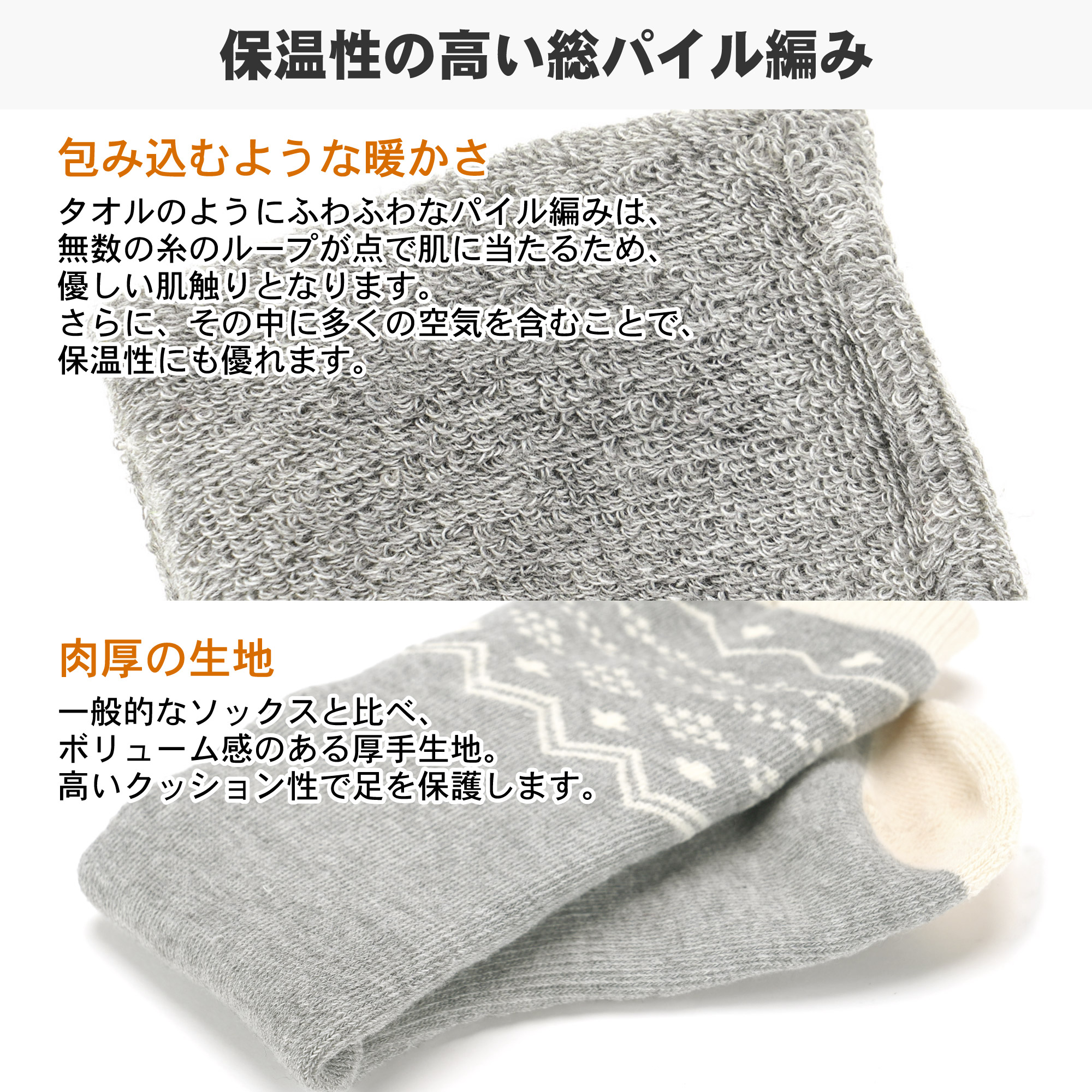 生産国:中国 品質:ポリエステル、ポリウレタン ・パイル編みでクッション性と保温性を両立 ・淡いカラーがポイントの雪柄ロング丈ソックス