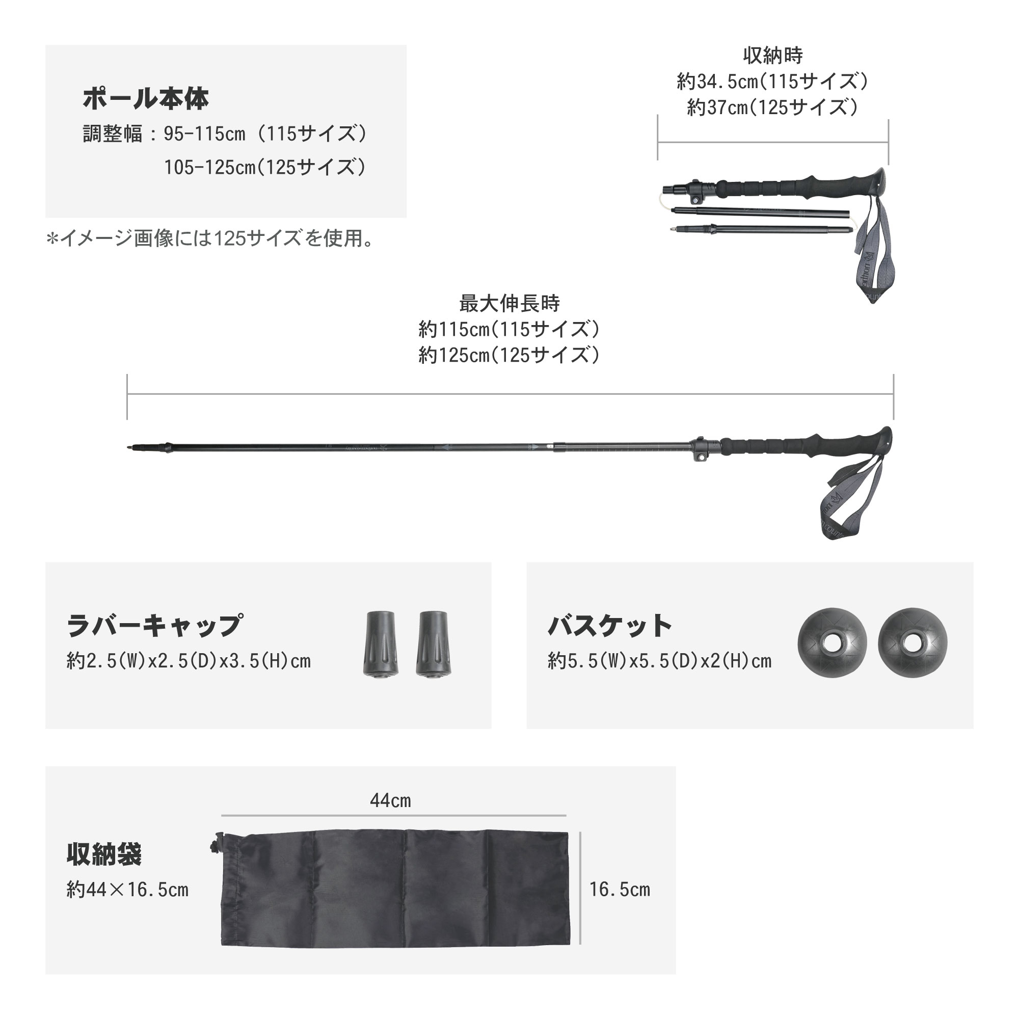 ・使用サイズ:125cm:105~125cm (収納時:約37cm)/115cm:95-115cm(収納時:約34.5cm)